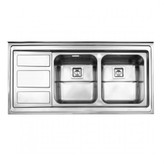 سینک 765 استیل البرز دارای دو لگن عمیق به عمق 21 سانتیمتر و ضخامت 0/8 میلیمتر و نیم باکسی می باشد.