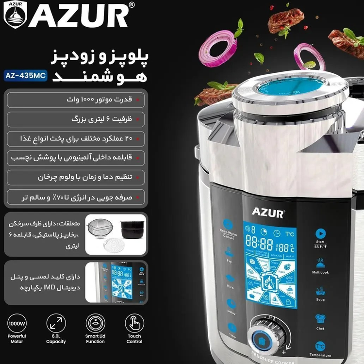 زودپز برقی آزور 435 یکی از بهترین پلوپز، بخارپز، آرام پز و مولتی کوکر چند کاره از کمپانی Azur با قیمت خرید مناسب و طرز استفاده راحت و مشخصات بی نظیر است که از 20 برنامه پخت از پیش تعیین شده و ظرفیت 6 لیتری برخوردار می باشد. پلوپز چند کاره آزور مدل AZ-435MC با انرژی مستقیم برق کار می کند و توان مصرفی آن نیز برابر با 1000 وات است. طول سیم برق این محصول برابر با 120 سانتی متر می باشد. با وجود این که توان مصرفی در این دستگاه نسبتا بالا می باشد، اما مصرف برق و انرژی در آن کاملا بهینه و کم مصرف و تا 70% قابلیت بهینه انرژی را دارد. این زودپز برقی آزور 435 با امکانات و برنامه های متنوعی که دارد، غذا ها را با بهترین روش ممکن و بدون کوچک ترین آسیب در طعم و بافت مواد غذایی آماده می کند. همچنین مناسب برای پخت انواع سوپ، خورشت، برنج، گوشت و … می باشد. به لطف این مولتی کوکر تفال می توانید غذاهای ایده آل و جذابی را برای کل خانواده به سهولت سرو کنید. تحت لیسانس فرانسه ساخت چین