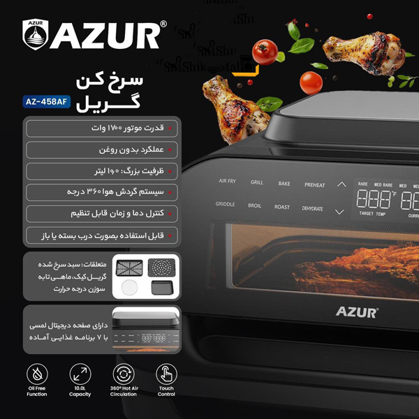 سرخ کن و گریل آزور مدل az-458af با برخورداری از قدرت موتور 1700 وات، یکی از جدید ترین و بهترین سرخ کن های برند Azur ساخت کشور فرانسه با قیمت خرید مناسب می باشد. این مدل سرخ کن آزور 458 دارای ظرفیتی معادل 100 لیتر است که بسیار کاربردی و مفید می باشد و برای آماده سازی غذا های مختلف مورد استفاده قرار می گیرد. این سرخ کن آزور 458 با برخورداری از 7 برنامه پخت از پیش تعیین شده برای تهیه انواع مواد غذایی از مرغ و سیب زمینی گرفته تا کیک و میوه خشک مورد استفاده قرار می گیرد. طراحی زیبا و کارایی مفیدی که گریل آزور 458 دارد این امکان را برای شما فراهم می کند تا بتوانید به وسیله ی آن انواع مختلفی از مواد غذایی را در کمترین زمان ممکن تهیه کنید. طرز استفاده از سرخ کن و گریل آزور مدل az-458af بسیار راحت است به گونه ای که کاربر می تواند به دلخواه دما و زمان آن را تنظیم کند.یکی از عوامل تاثیر گذار بر قیمت سرخ کن و گریل آزور 458 برخورداری از بدنه مستحکم، 7 برنامه پخت، طراحی بسیار زیبا، توان مصرفی بالا، بدارای ظرفیت مناسب و… می باشد. تنوع پخت در سرخ کن آزور مدل 458 به کمک صفحه گریل، سبد سرخکن و محفظه پخت امکانپذیر است. این قطعات مختلف به شما این امکان را می دهند که انواع غذاها را با روش های مختلف از جمله سرخ کردن، گریل کردن و پختن آماده کنید که موجب افزایش انعطاف پذیری و کارایی دستگاه می شود. از دیگر عوامل تاثیر گذار بر قیمت سرخ کن و گریل آزور 458، چند کاره بودن آن و همچنین داشتن قابلیت تنظیم دما و زمان به صورت دستی است که می توانید فرایند پخت و پز را با کمترین میزان مصرف روغن و یا حتی بدون روغن از طریق تنظیم دمای صفحه سرخ کن یا گریل آن به سادگی انجام دهید. اگر به دنبال خرید یک سرخکن اصل و با کیفیت هستید ما به شما سرخ کن حرفه ای چند کاره آزور مدل AZ-458AF، ساخت کشور فرانسه را پیشنهاد می کنیم.